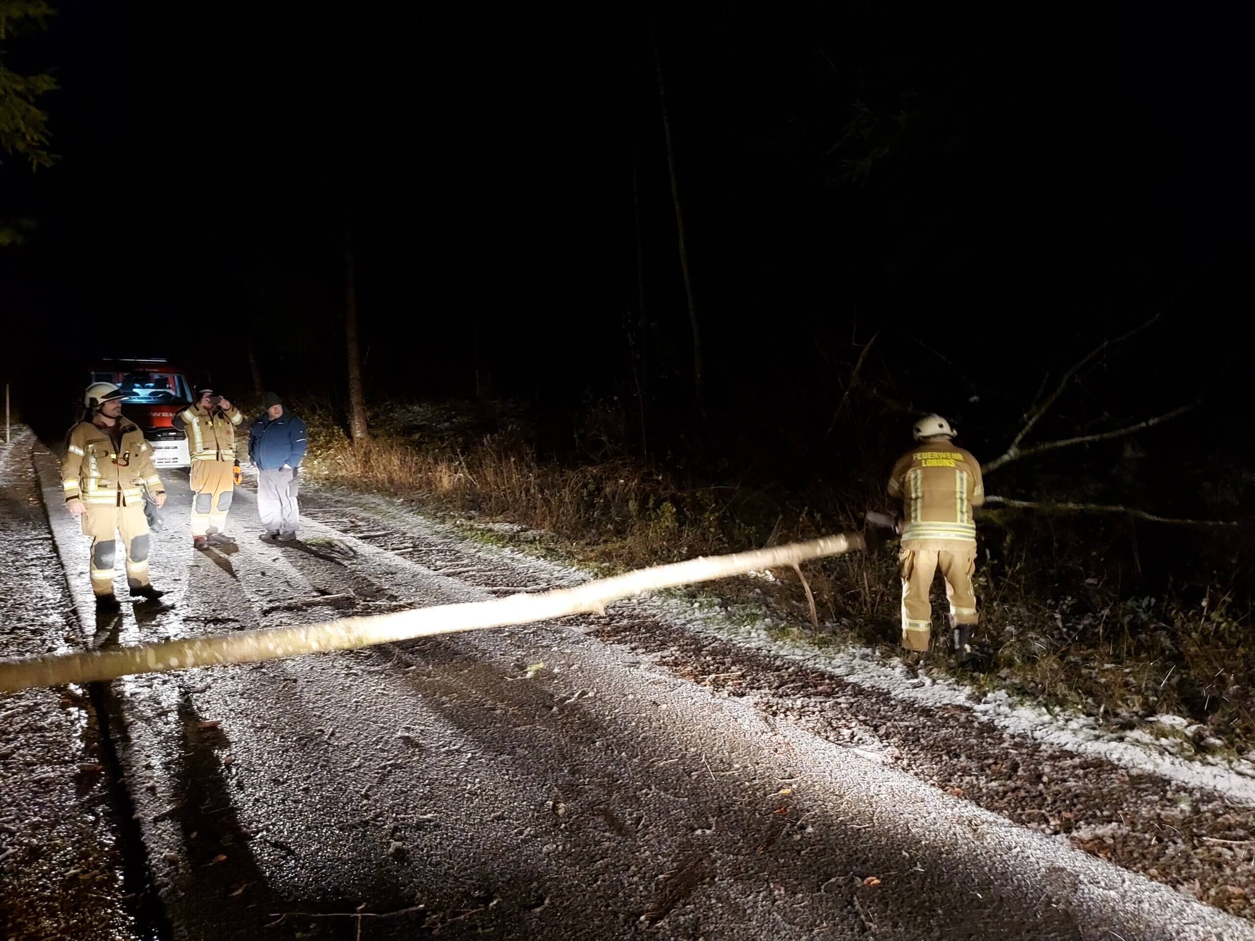 Heute sind wir gegen 06:00 Uhr ausgerückt um zusammen mit der Feuerwehr St. Anton einen Baum von der L188 weg zu räumen. Durch den starken Wind ist dieser auf die Strasse gefallen und hat eine Fahrspur blockiert.