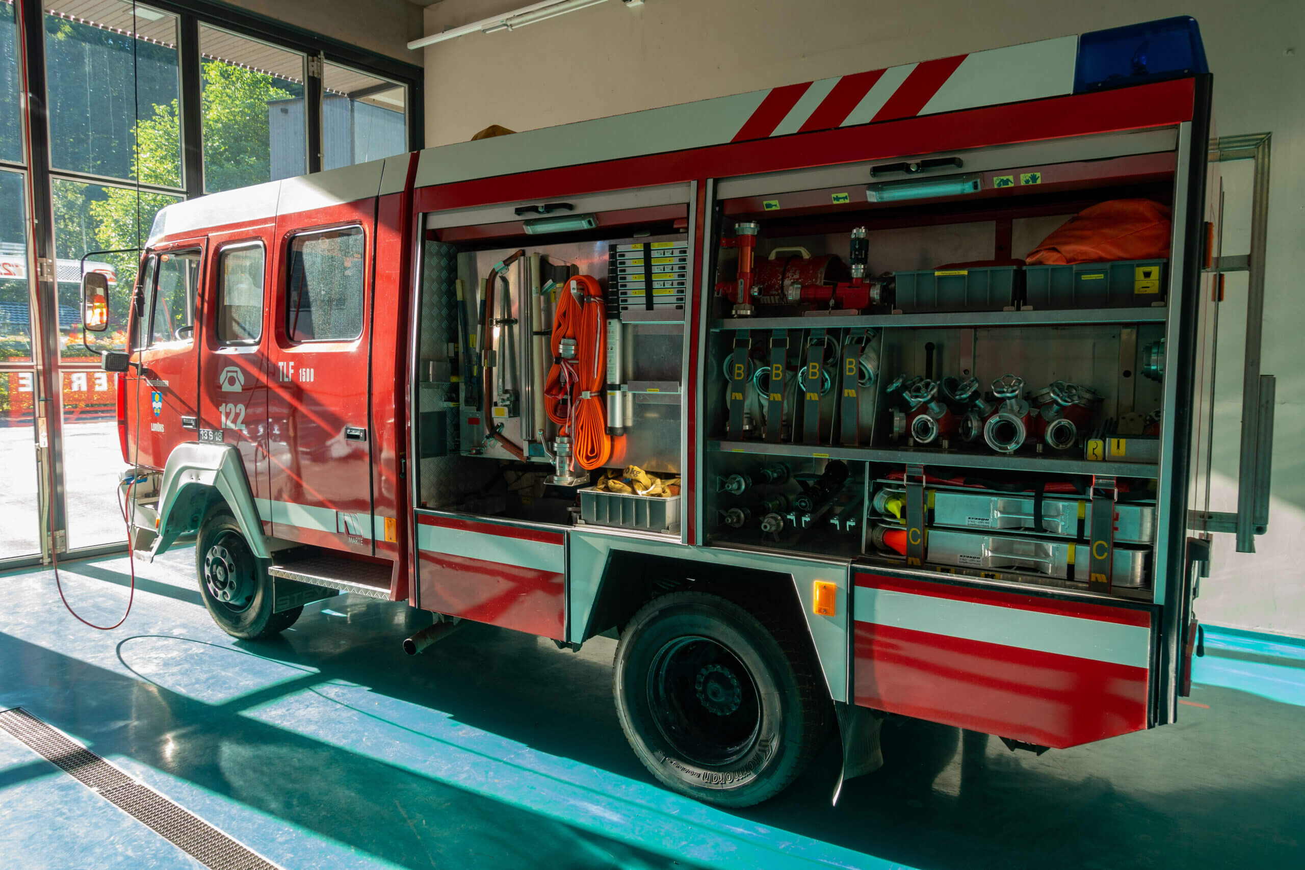 3 Atemschutzgeräte, Notstromaggregat, 500m Schläuche, Schlauchpakete, Funkgeräte, Lampen, Rettungsleinen und Arbeitsleinen, Hitzeschutzbekleidung, Schiebeleiter, Rettungsschlitten, Kettensäge, Greifzug, Stockwinde sowie verschiedene Armaturen, Werkzeuge und Erste Hilfe Ausrüstung.